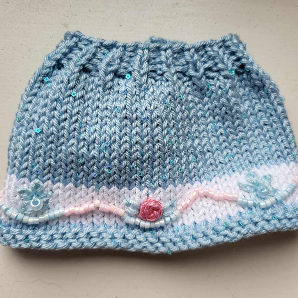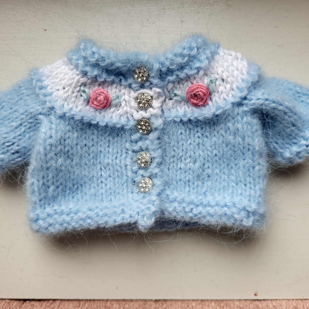 Meet this charming little bunny, lovingly hand-knitted by Valerie of Customs Bunnies and Bears. Standing at approximately 29cm tall, she’s dressed to impress in her pretty pale blue suit with sparkling details on the buttons of her suit jacket. Her outfit is finished with a sweet bow and delicate embellishments that make her extra special,so special we gave her her own page!