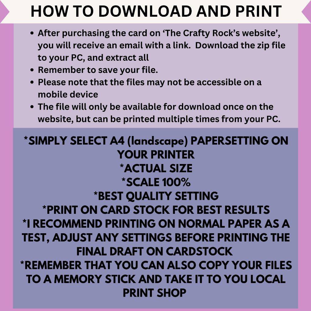 Just select 'landscape' paper orientation and we advise you to practise on a normal A4 office paper before printing the final draft on cardstock. Remember to select the 'best' printing quality for this print. If you have any problems with the printing of this card, please let us know.