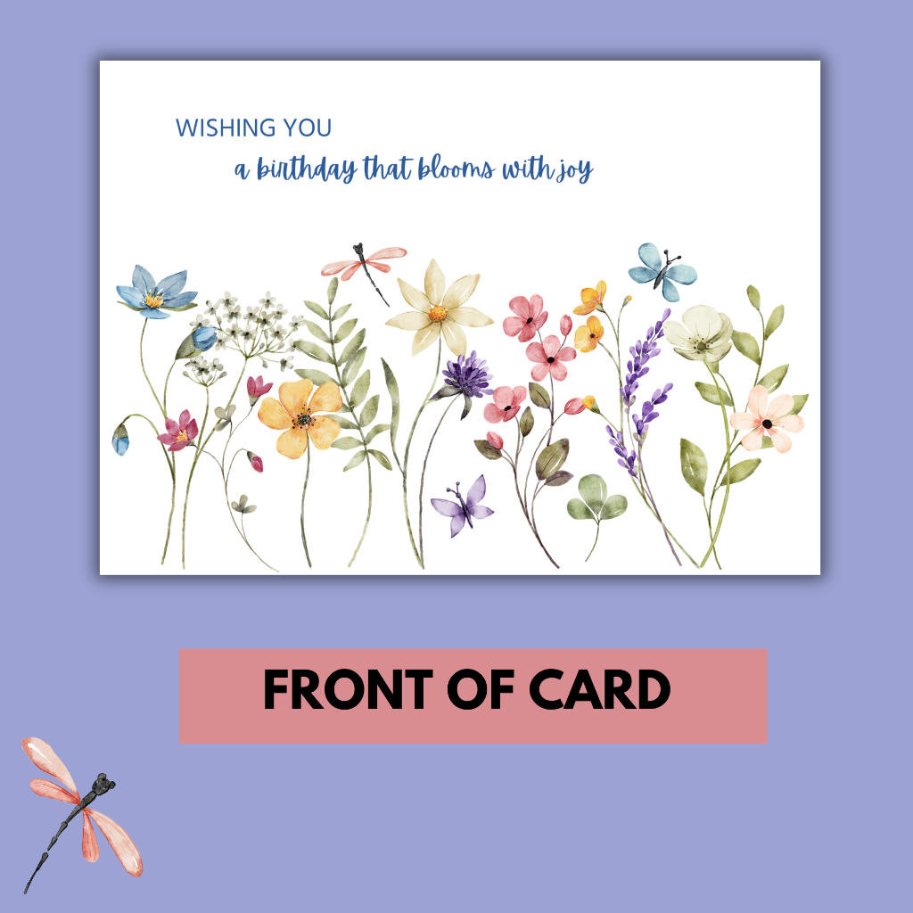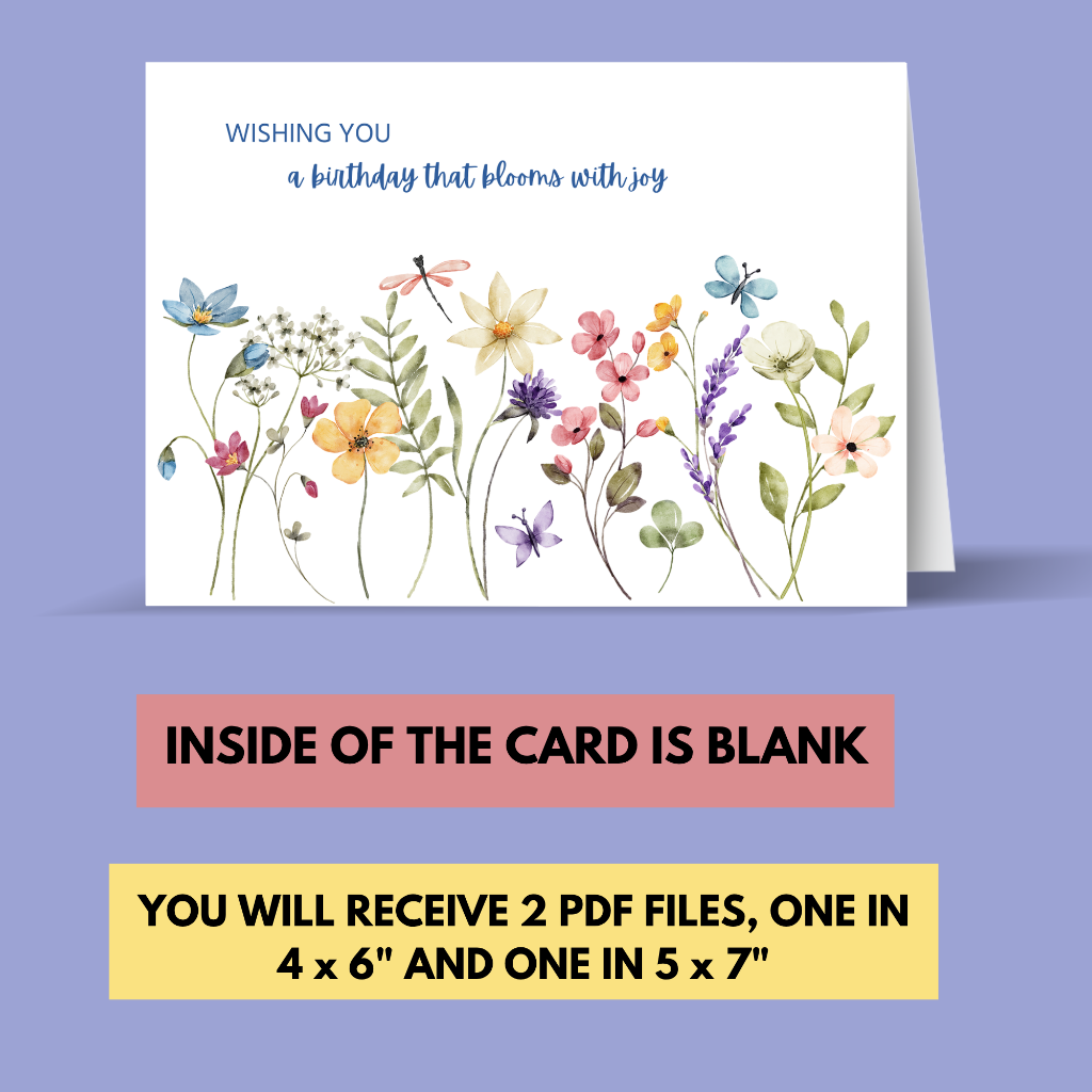 This colourful floral digital printable birthday card is the perfect way to celebrate someone's special day! Featuring the sweet words "Wishing you a birthday that blooms with joy " on the front, this design includes colourful wildflowers creating a pop of brightness. The card is blank inside, allowing you to personalize it with your own message. Ideal for young girls, women, or teenagers, this downloadable and printable card is a thoughtful and vibrant way to wish someone a happy birthday! Simply download, print, and give a card that shows you care.