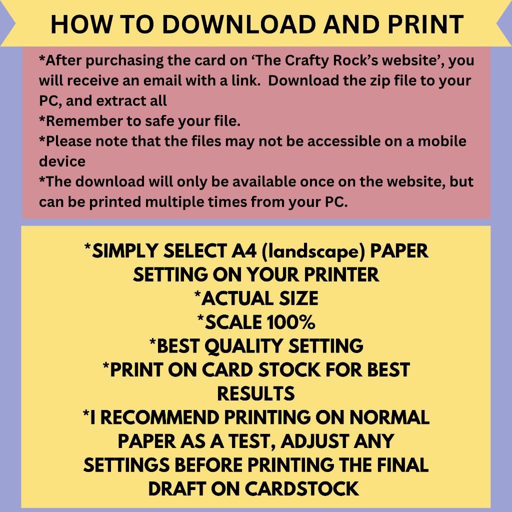 Just select 'landscape' paper orientation and I will advise you to practise on a normal A4 office paper before printing the final draft on cardstock. Remember to select the 'best' printing quality for this print. If you have any problems with the printing of this card, please let us know.