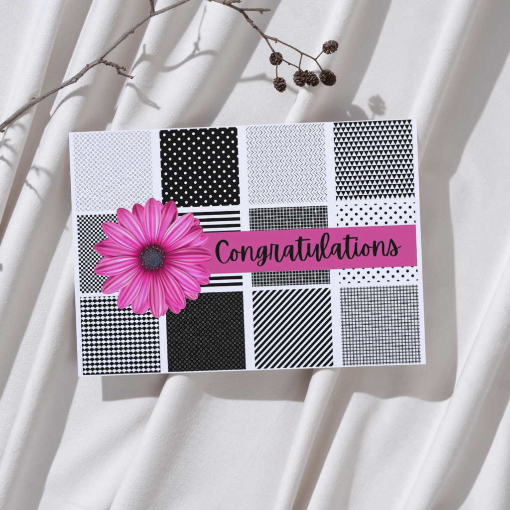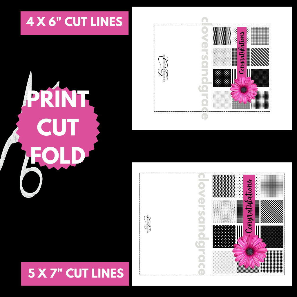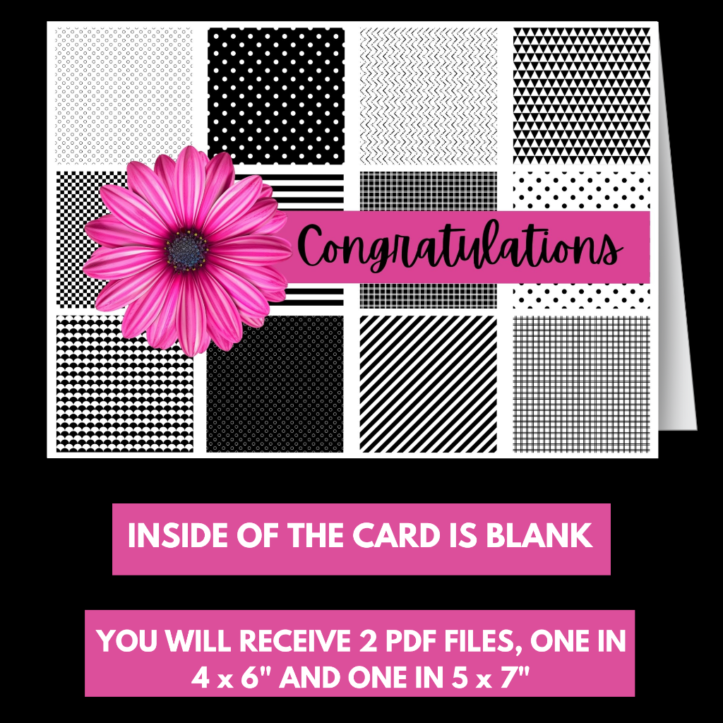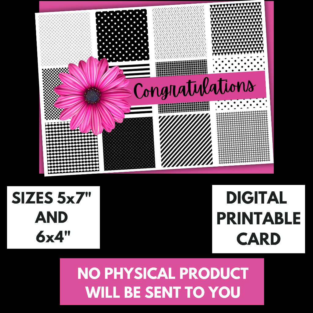 Striking and stunning.... this black, white and shocking pink Printable Congratulations card is an Instant download and can be Printed at home. Being a Digital card, you won't receive a physical item, but after purchase, you will immediately have your printable card ready... no shipping.... no waiting.