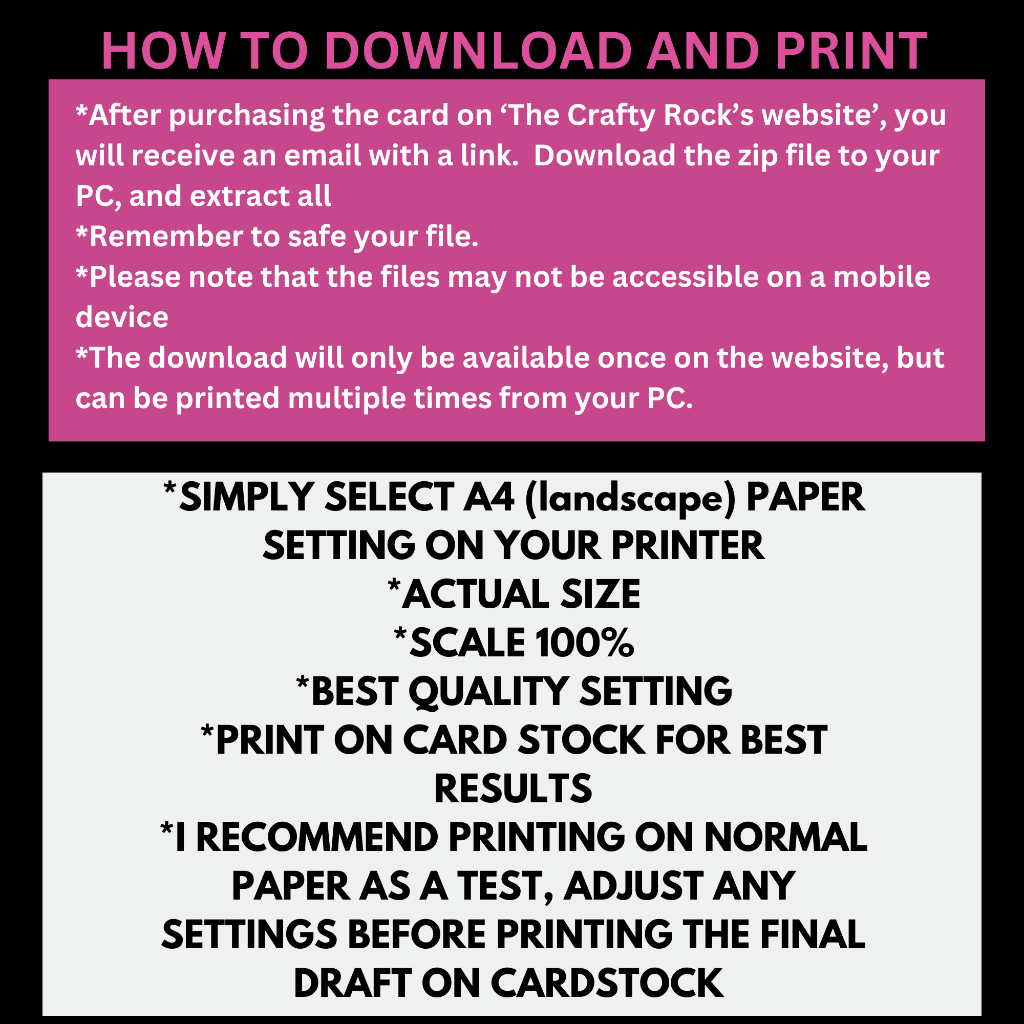 Simply download the file, load card stock in your printer, select A4 landscape and 'best' printing quality and you're good to go.