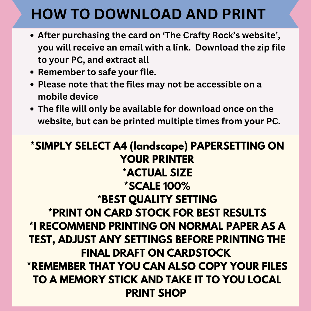 Simply download the file, load card stock in your printer, select A4 landscape and 'best' printing quality and you're good to go.
