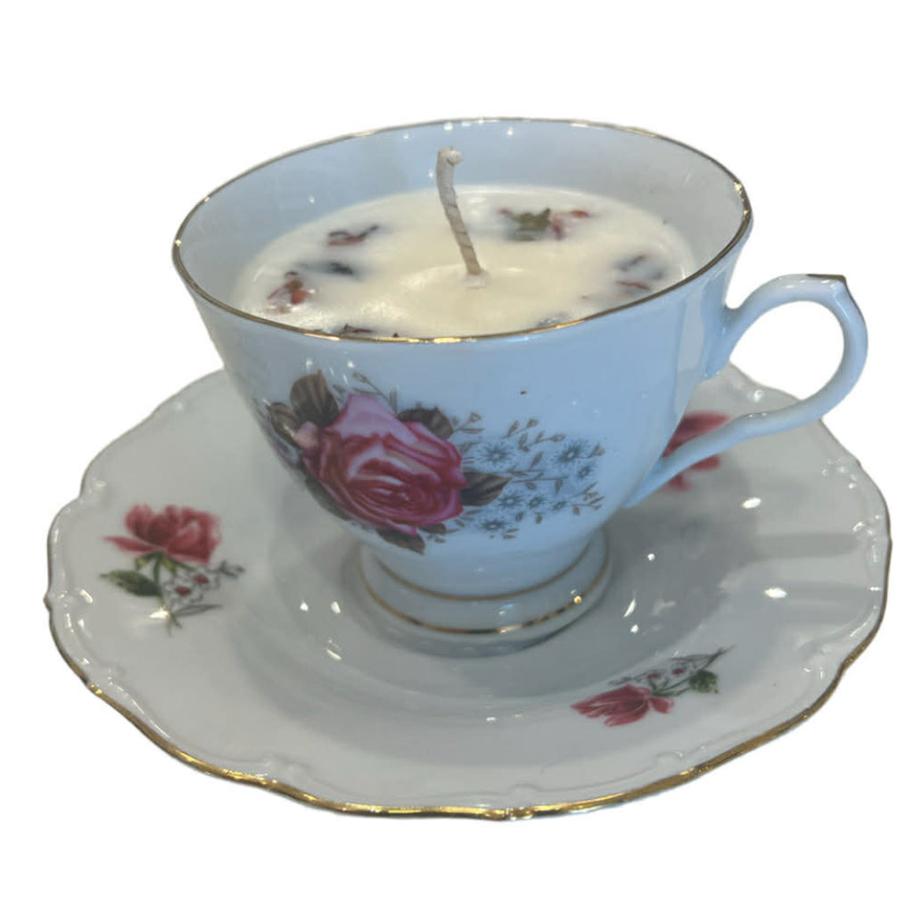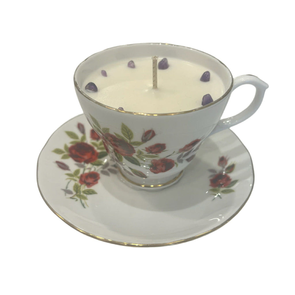 Unwind with these beautiful tea cup candles featuring essential aromatherapy oils , natural healing crystals or wax flowers.