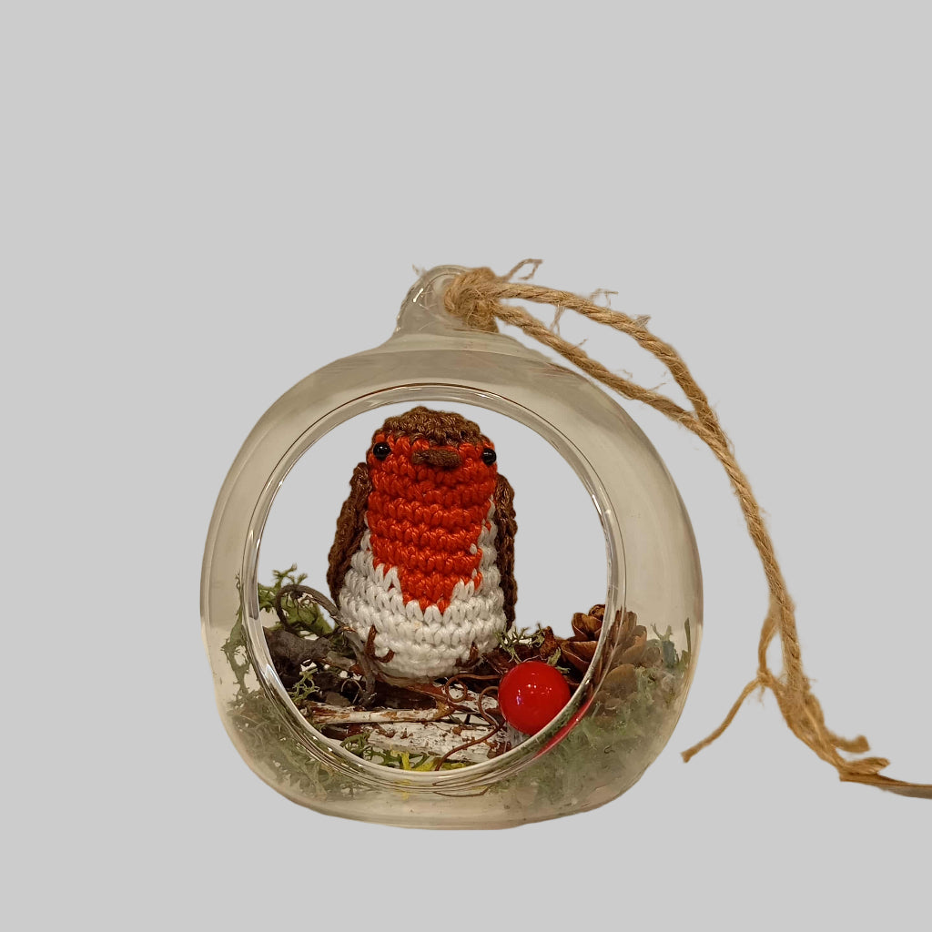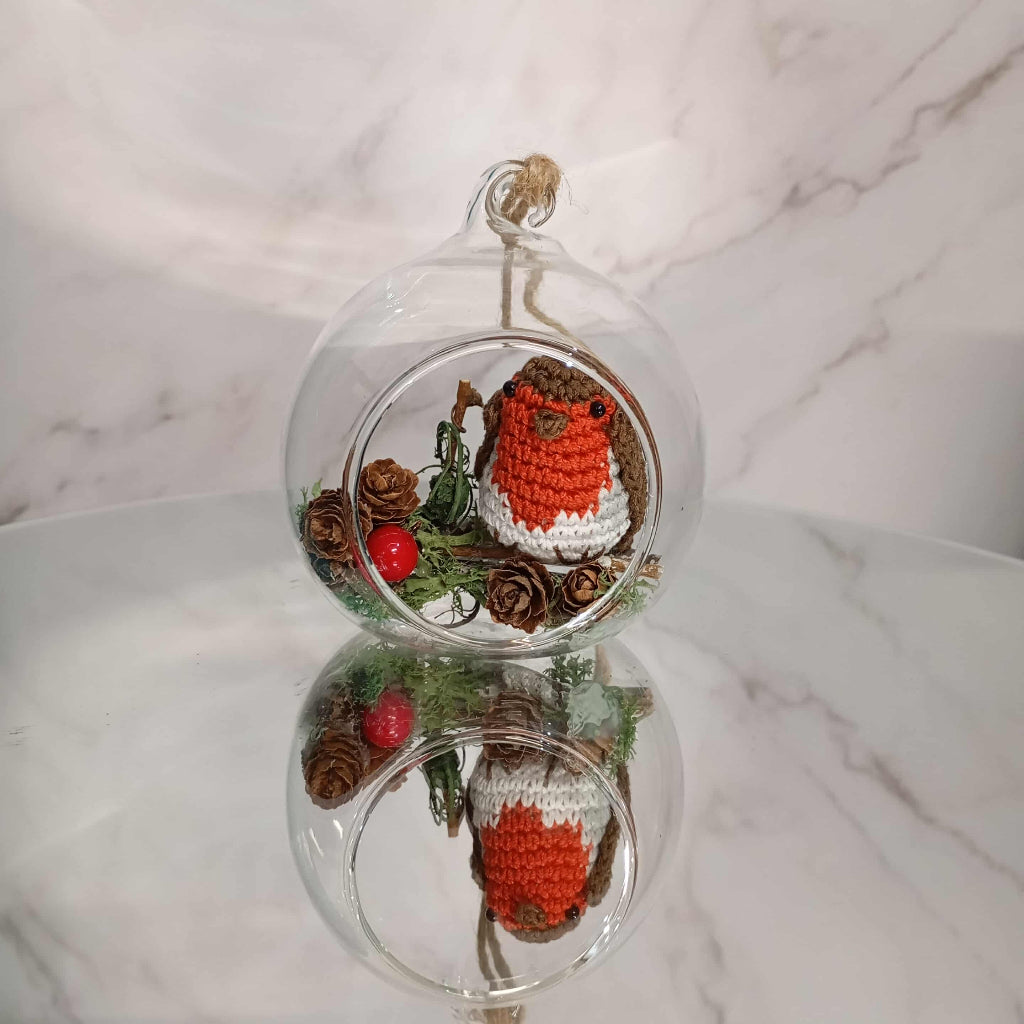 This charming little robin has been beautifully crocheted by local crafter Miki of Mikiloops Loops Crafts and delicately displayed inside a clear glass globe. Each piece is unique, featuring a lifelike robin perched among soft moss and natural accents — a perfect blend of craft and nature.