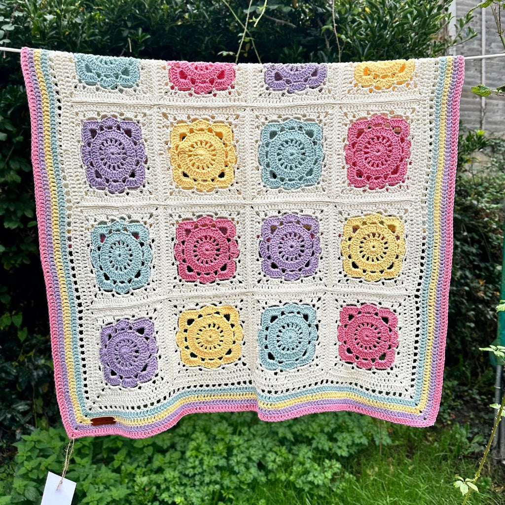 This beautiful blanket is made up of colourful floral granny squares, joined together to create a cheerful and timeless design. Featuring shades of pink, yellow, lilac, mint and white, it brings a soft sweet feel that’s perfect for little ones.