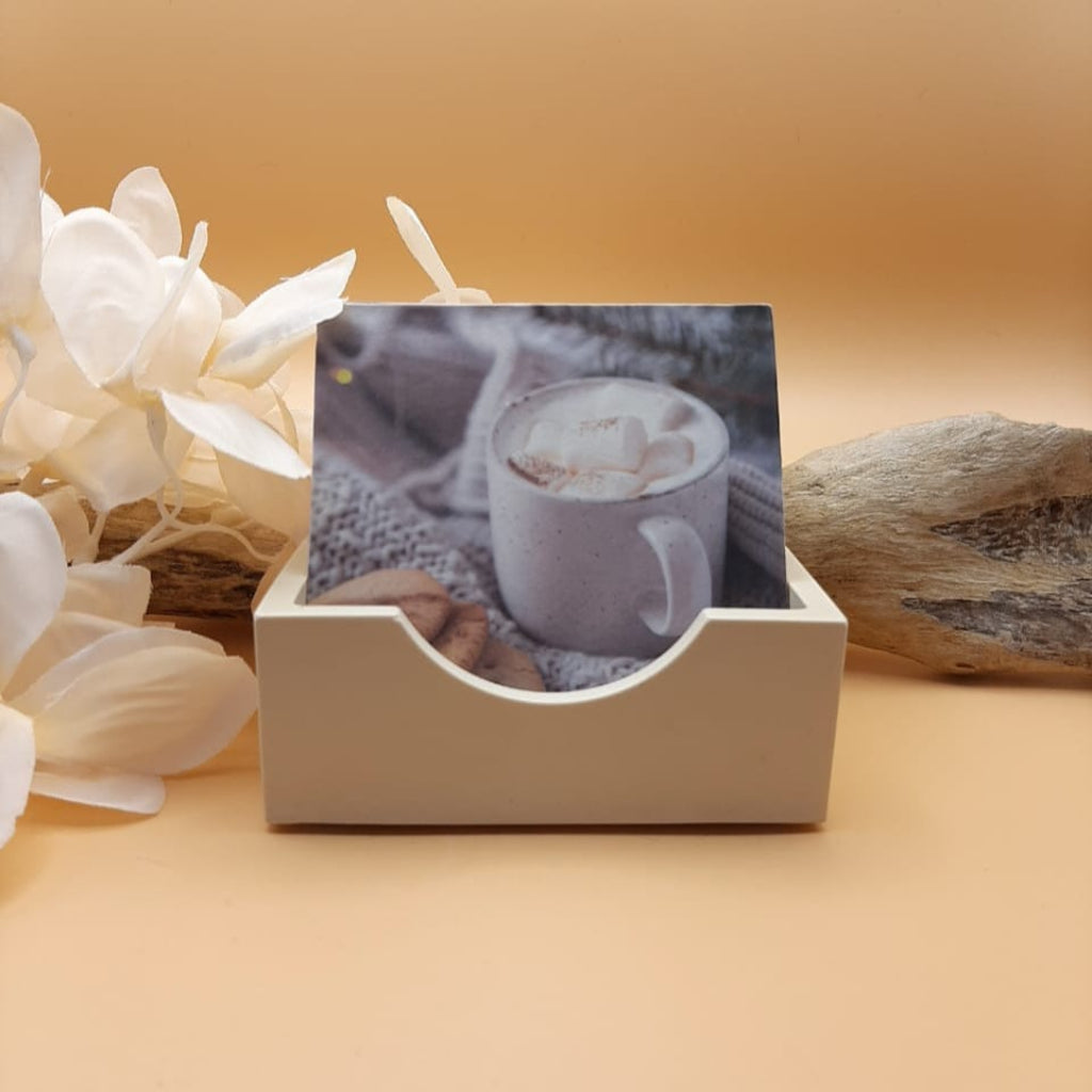 A charming set of handmade Jesmonite coasters, each one decoupaged with soft winter imagery — think hot chocolate, cosy firesides, frosty cottages, and peaceful winter moments. Perfect for adding a touch of seasonal warmth to your coffee table, desk, or dining space.