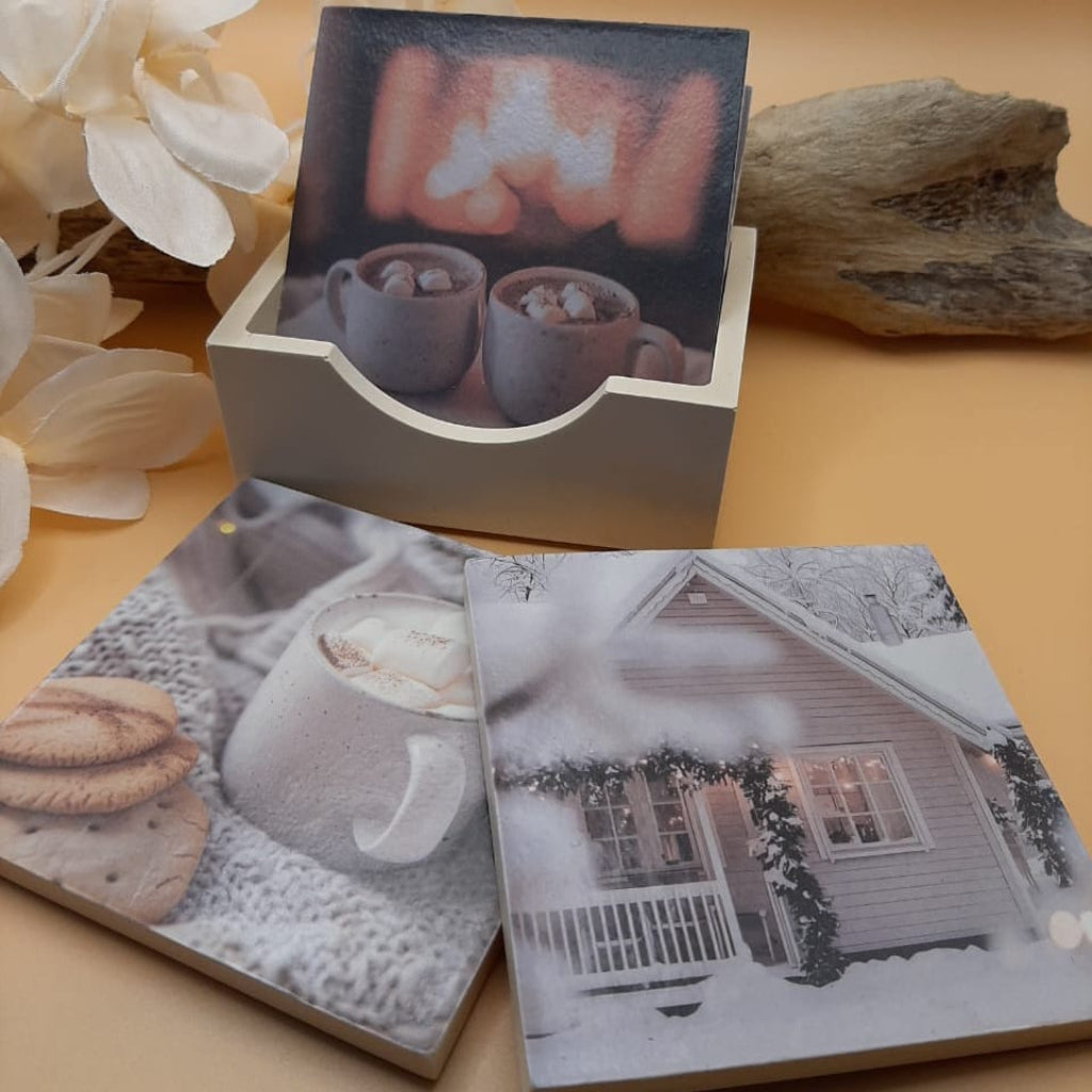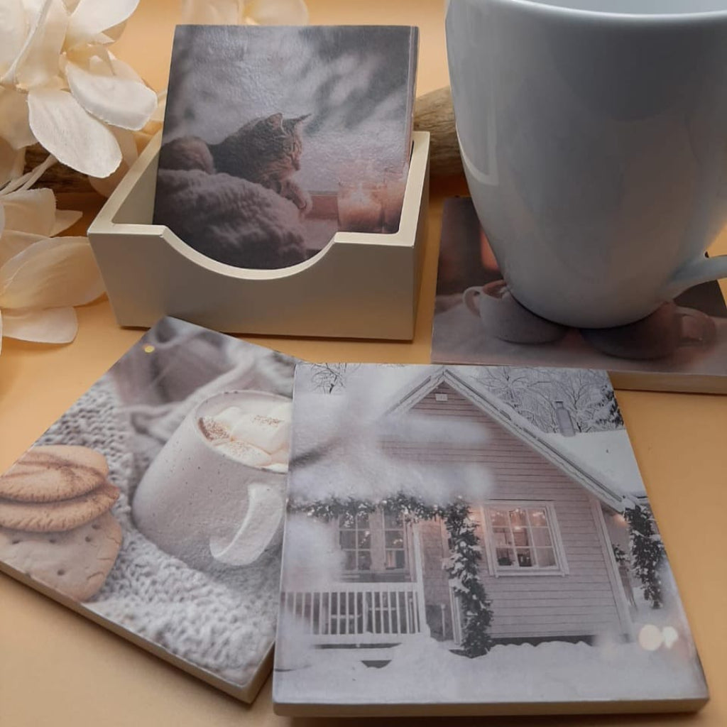 The set includes four 9×9 cm coasters featuring beautifully detailed winter scenes, along with a matching Jesmonite holder to keep them neatly stacked when not in use.